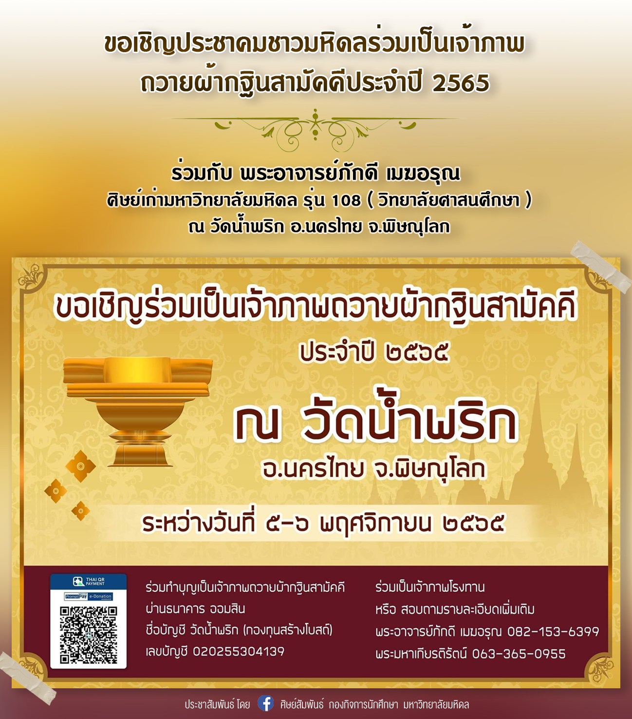 ขอเชิญประชาคมชาวมหิดลร่วมเป็นเจ้าภาพถวายผ้ากฐินสามัคคี ประจำปี 2565