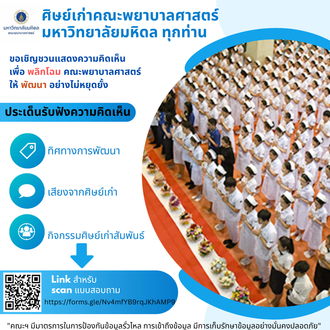 คณะพยาบาลศาสตร์ มหาวิทยาลัยมหิดลขอเชิญชวน “ศิษย์เก่าคณะพยาบาลศาสตร์” ทุกท่าน ร่วมเป็นส่วนหนึ่งในการ #พลิกโฉม และ #พัฒนา#อย่างยั่งยืน โดยร่วมให้ข้อมูลและเสนอความคิดเห็นทาง