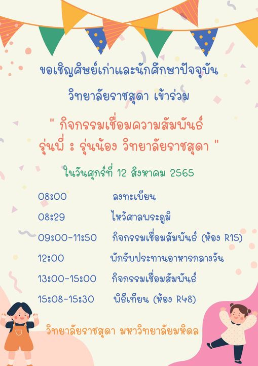 ขอเชิญศิษย์เก่าและนักศึกษาปัจจุบันเข้าร่วมกิจกรรมดังกล่าวในวันศุกร์ที่ 12 สิงหาคม 2565