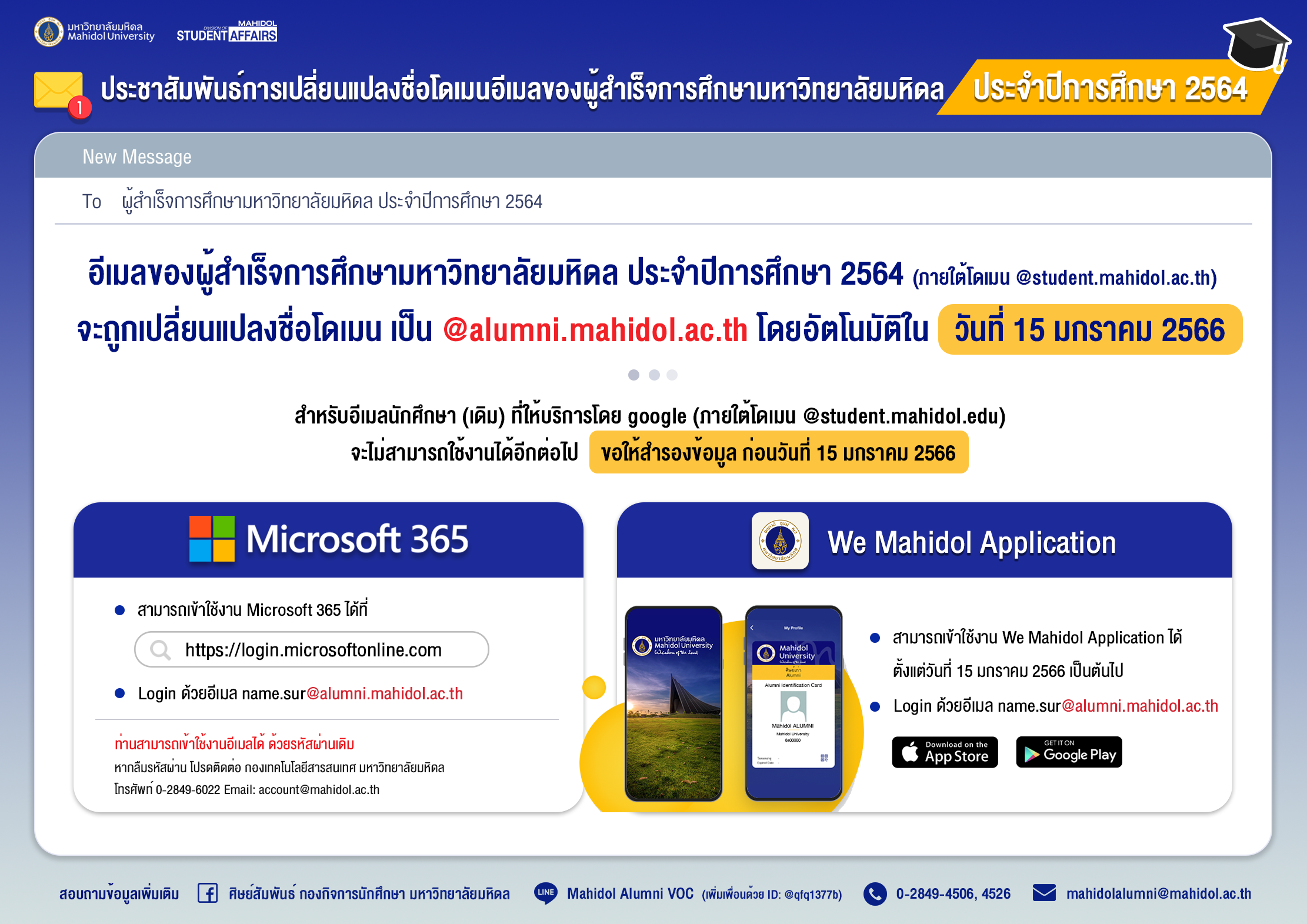 หรือ Email: mahidolalumni@mahidol.ac.th